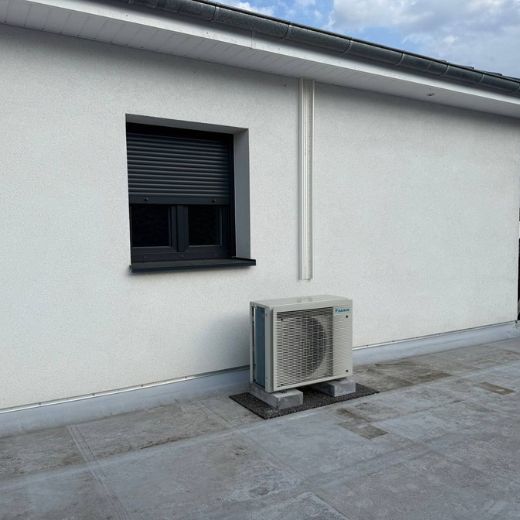 Besteht aus einer Außeneinheit und einer Inneneinheit, die über Kältemittelleitungen verbunden sind. Sie ist extrem energieeffizient und arbeitet sehr leise, da der laute Kompressor außen sitzt.